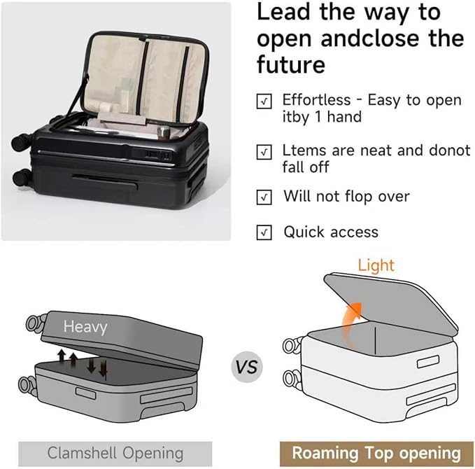 - 【Dual Opening Design】: Featuring an innovative dual-opening mechanism that allows for effortless opening or closing of the suitcase. The half-opening design accommodates a 15.6-inch laptop and other small items, enhancing both loading convenience and space efficiency. This design addresses the challenge of traditional two-compartment luggage being difficult to open or close under heavy load while preventing item displacement.