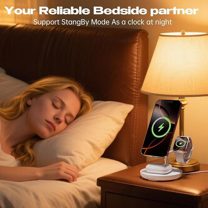 - MAG SAFE PRECISION ALIGNMENT & FAST CHARGING STAND. Strong magnetic charger for iPhone.Snap Phone into perfect charging position instantly. No more coil hunting or adjustment needed.This 3-in-1 Magnetic Wireless phone Charger provides a fast charging for iPhone,iWatch and AirPod Simultaneously.The charging stand for iPhone supports iOS StandBy mode to display clock,widgets and photos.Perfect for desks,nightstands, or kitchen use. It is a useful magnetic charger for iphone.