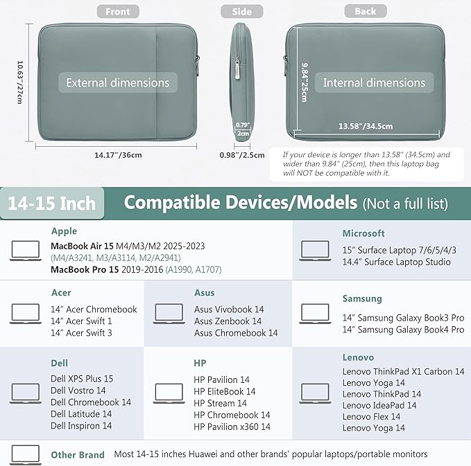 - Internal Dimensions: 13.58" x 9.84" x 0.79". Compatible with MacBook Air 15 M4/M3/M2 2025-2023(A3241, A3114, A2941), MacBook Pro 15 2019-2016(A1990, A1707), 14.4" Surface Laptop Studio, 15" Surface Laptop, HP Pavilion/EliteBook/Stream/Chromebook/Pavilion X360 14, Dell XPS 14/15 Plus, Dell Vostro/Chromebook/Latitude/Inspiron 14, Asus Vivobook/Zenbook/Chromebook 14, 14" Acer Chromebook/Swift 1/3, ThinkPad/IdeaPad/Flex/Yoga 14, ThinkPad X1 Carbon/Yoga 14, 14" Samsung Galaxy Book3/Book4 Pro, etc.