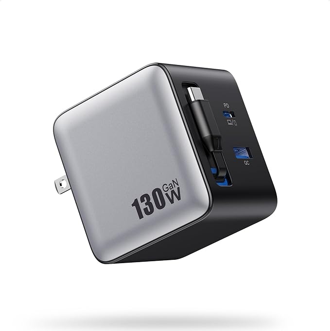 130W USB C Charger Built-in Retractable Cable,Upgraded GaN IV 3 in 1 Fast Charging Station Foldable Plug Wall Charger,PD PPS 65W Laptop Adapter for MacBook Pro/Air,iPad,iPhone 16/Pro,Galaxy S25,Dell
