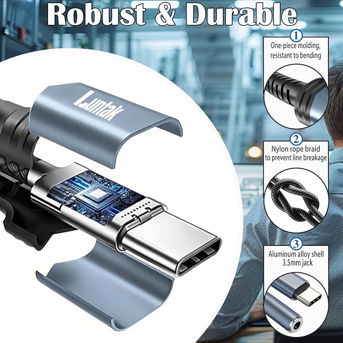 - 【Durable &Reliable】-This headphone jack to usb c is made of aluminum alloy and 48-strand armor braided wire. The aluminum alloy shell has high bending strength and can effectively resist daily drops and impacts. The usbc to 3.5mm jack audio adapter has heat dissipation properties and can quickly export heat from the DAC chip and circuit to maintain high-fidelity sound quality. The electromagnetic shielding function can isolate the mobile phone signal from interfering with the audio signal, avoiding "crackling" sound when listening to songs.