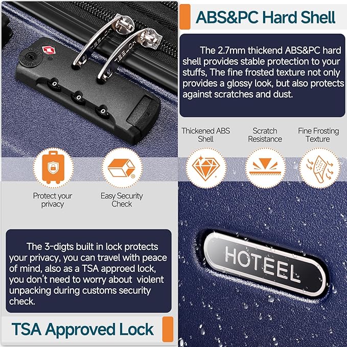 - TSA Lock and Hard Shell: Made of scratch-resistant ABS+PC composite material, the suitcase ensures reliable protection for your belongings and long-lasting appearance. The TSA-approved lock safeguards personal items and avoids violent openings during security checks.