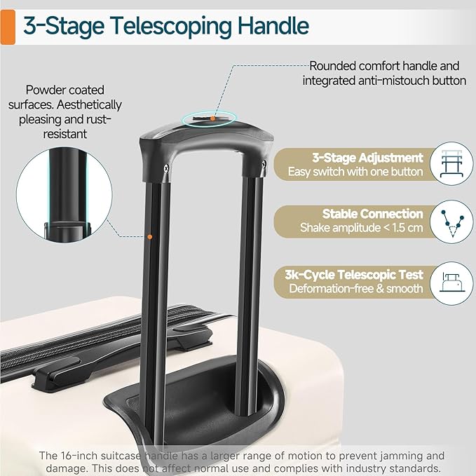 - Practical Additional Features: The rubber top/side handles ensure a comfortable grip when lifting, and 4 raised bottom feet keep the suitcase stable and protected from ground dirt during placement.