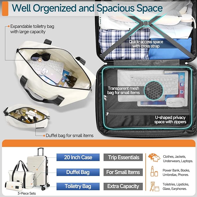 - 1 Set for Multiple Needs: The Luggage sets include a 20-inch carry-on suitcase, a spacious duffle bag for bulkier items like clothes, laptops, and umbrellas, and a toiletry bag for toiletries and cosmetics. Perfectly designed to meet diverse storage needs during travel.