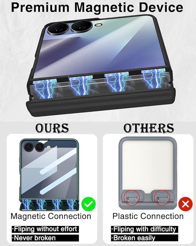 - [Advanced Hinge Protection]: Our Z Flip 7 case features an innovative hinge protection design specifically for the Galaxy Flip 7, providing complete protection from all angles. Our Z Flip 7 case is designed with a unique magnetic connection that won't be broken by impacts such as drops. Besides, our z Flip 7 case with unique design flips more smoothly without spring resistance.