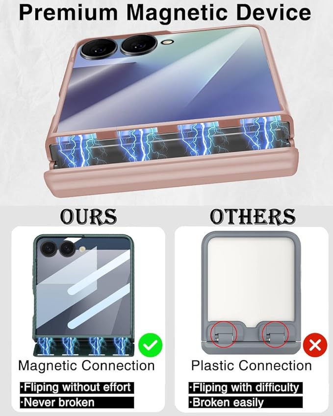 - [Advanced Hinge Protection]: Our Z Flip 7 case features an innovative hinge protection design specifically for the Galaxy Flip 7, providing complete protection from all angles. Our Z Flip 7 case is designed with a unique magnetic connection that won't be broken by impacts such as drops. Besides, our z Flip 7 case with unique design flips more smoothly without spring resistance.