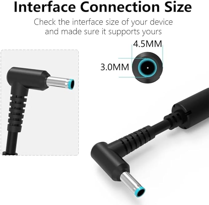- HP Gaming Laptop Charger Specifications: Input: AC 100-240V£¬Output: 19.5V 7.7A .HP Charger Connector size:4.5 x 3.0mm.Pay attention to the size of the DC charging head. This HP Power Supply 19.5V charger has a rated power of 150 watts. Please carefully check the power parameters of your existing HP laptop! Please verify the current and voltage of your original HP laptop Ac Adapter