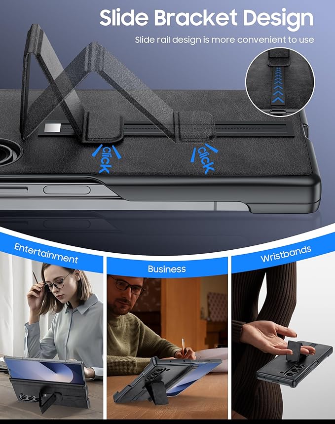 - Slide-and-Push Hidden Kickstand: Simply slide up the rail and the cleverly designed hand strap raises to create a stable phone stand for hands-free viewing, locking securely in place. If you need to use your phone, you just need to put your fingers through the strap on the back of the Galaxy Fold 6 case. for a drop-proof grip. This dual-function device simply slides down to completely flatten out, seamlessly concealed, and maintains a slim appearance. Push and slide for safe, convenient control!