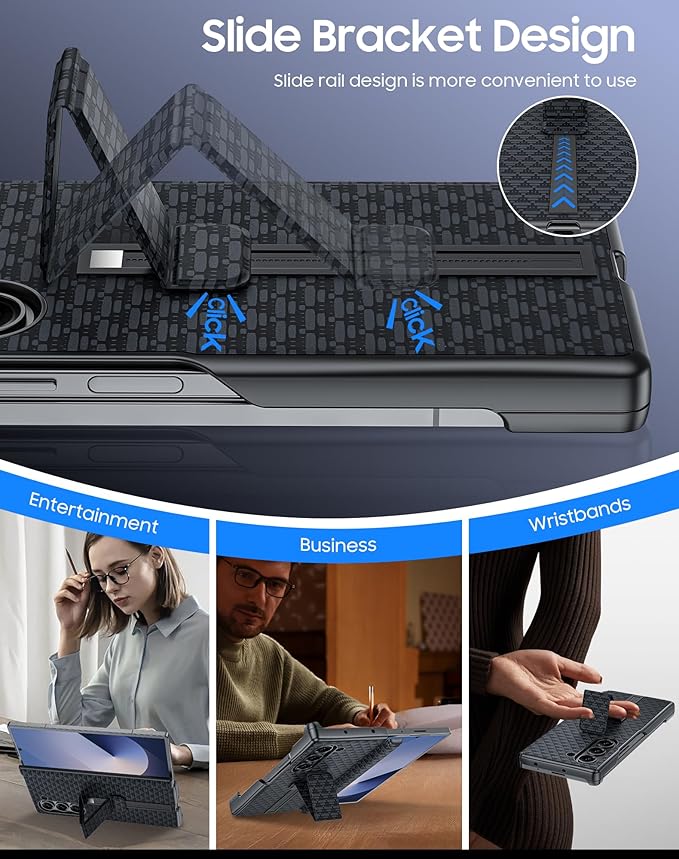 - Slide-and-Push Hidden Kickstand: Simply slide up the rail and the cleverly designed hand strap raises to create a stable phone stand for hands-free viewing, locking securely in place. If you need to use your phone, you just need to put your fingers through the strap on the back of the Galaxy Fold 6 case. for a drop-proof grip. This dual-function device simply slides down to completely flatten out, seamlessly concealed, and maintains a slim appearance. Push and slide for safe, convenient control!