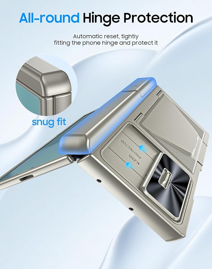 - Sliding Lens Protective Cover: This Galaxy Z Fold 7 case built in sliding camera lens cover. The newly designed sliding camera cover has a more sensitive slide rail and a safer lock than previous versions. The grinding mark on the lens cover and the raised side design allow you to slide the lens cover more easily. When you don't need to use the camera, you can fully cover the camera lens with just one second to protect your Galaxy Z Fold 7 phone lens from scratches and damage.