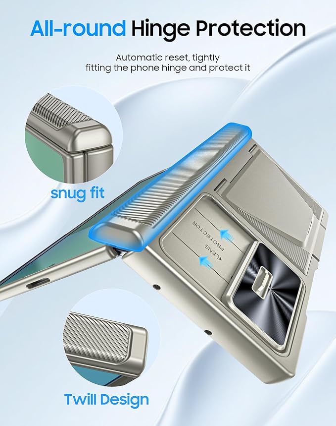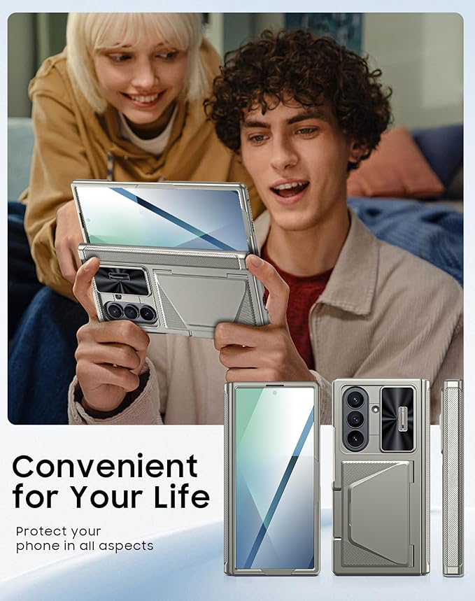 - Sliding Lens Protective Cover: This Galaxy Z Fold 7 case built in sliding camera lens cover. The newly designed sliding camera cover has a more sensitive slide rail and a safer lock than previous versions. The grinding mark on the lens cover and the raised side design allow you to slide the lens cover more easily. When you don't need to use the camera, you can fully cover the camera lens with just one second to protect your Galaxy Z Fold 7 phone lens from scratches and damage.