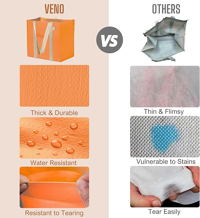- Reusable & Sustainable – VENO reusable grocery shopping bags are created through maximizing the use of post-consumer material to make high-grade bags that save plastic from ending up in oceans, lakes, and landfills. Collapsible and foldable for future use and easy storage in your car, glove compartment, kitchen, cabinet, drawer, luggage, or purse!