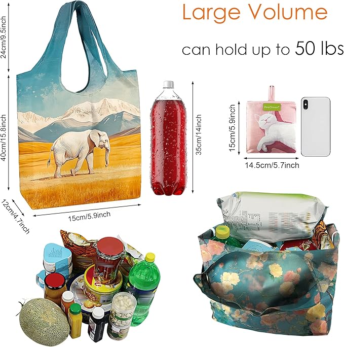 - X-LARGE CAPACITY & Sturdy: These cute reusable grocery bags are very large which can hold up to 50+ pounds of groceries and replaces 2-3 conventional grocery bags. And these foldable reusable grocery bags are reinforced with bias tape which makes them hold heavy loads safely. Long handles of the large reusable shopping bags allow for hand holding or carry on the shoulder for easier carrying, ideal reusable grocery bags bulk for shopping, groceries, travel, storage.