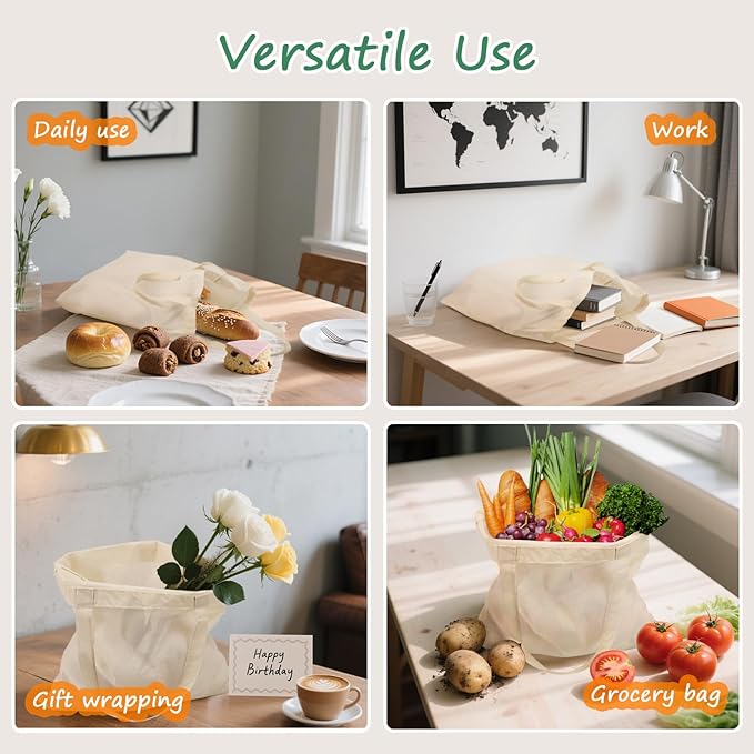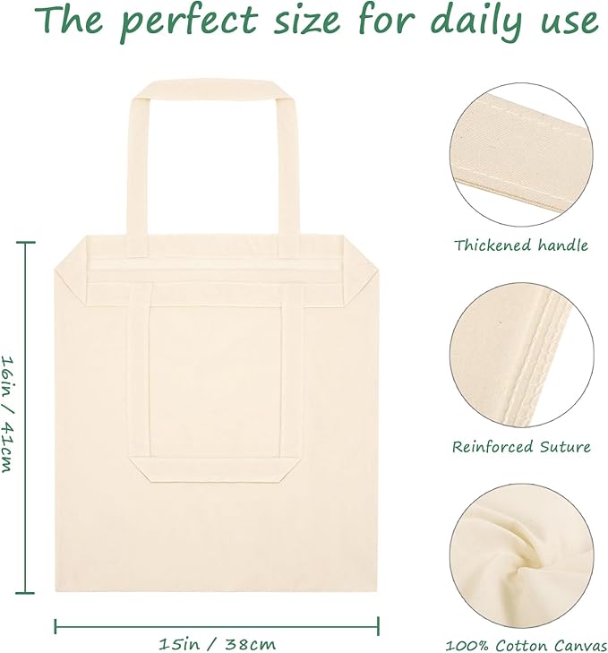 - 【Package Contents】This package includes 20 cotton tote bags, each measuring 15×16 inches (38×40 cm), crafted from 100% 5oz natural cotton. The bags feature lock stitching on the inside and reinforced compact stitching throughout to ensure maximum durability and enhanced load-bearing capacity. Additionally, the reinforced handle enhances carrying comfort whether by hand or over the shoulder
