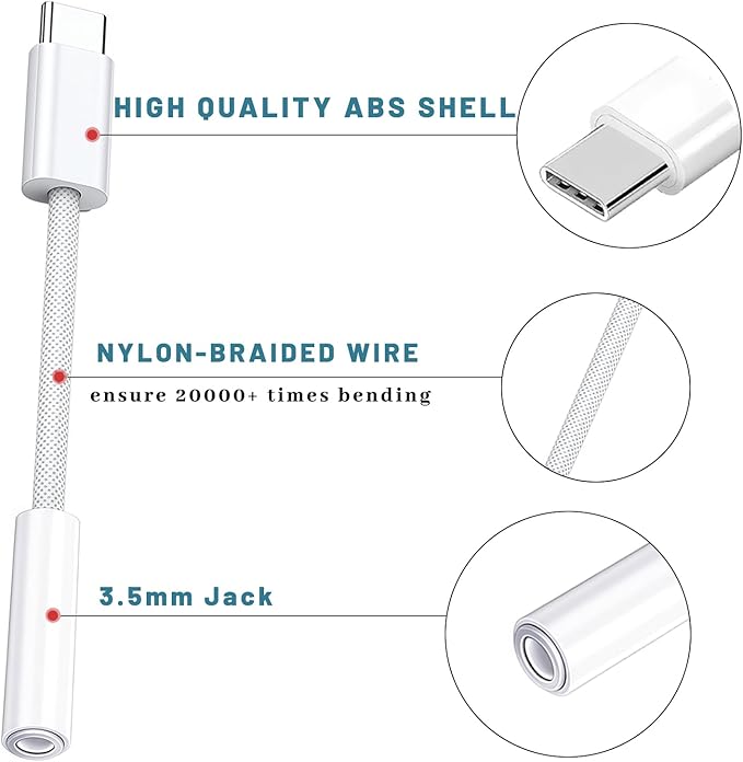 - šćHigh quality & DurablećThe usb c to 3.5mm audio adapter adopts High quality ABS and nylon anti winding wire, which ensures that the usbc to headphone jack adapter could easily bend 20000+.Shielded enamel wire could still ensure stable signal transmission with daily use.