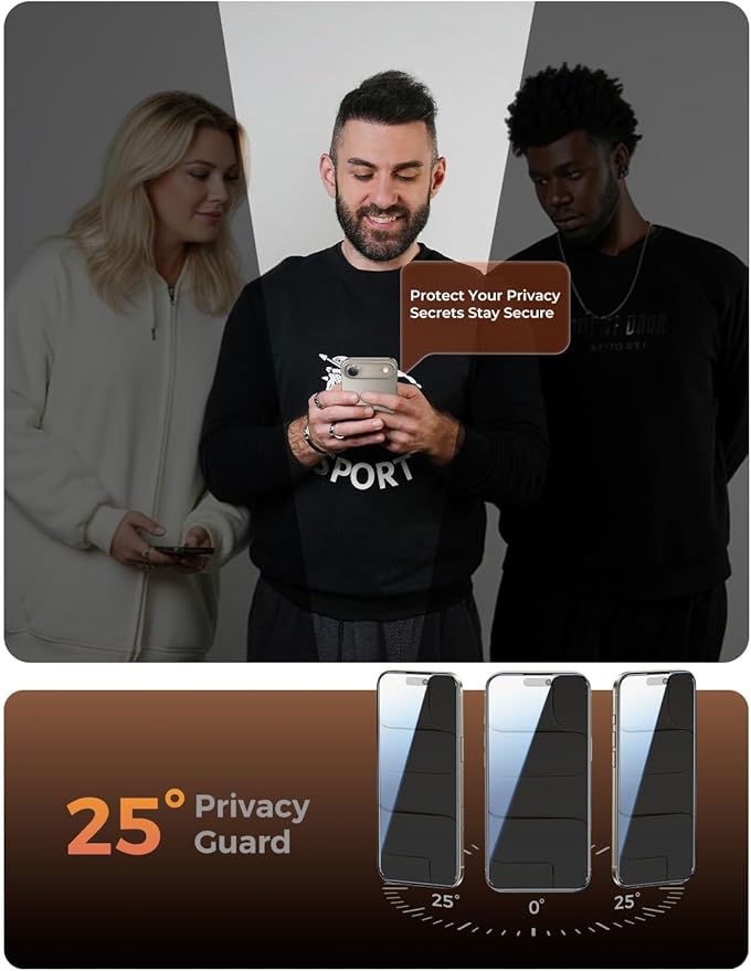 - 25° Privacy Protection:25° Viewing Angle for Enhanced Privacy. Equipped with advanced 25° anti-peep technology, this iPhone Air privacy screen protector ensures that your screen content is only visible within a 25° viewing angle. This effectively prevents others from seeing your screen content when viewed from the side, providing superior privacy protection for your personal and sensitive information