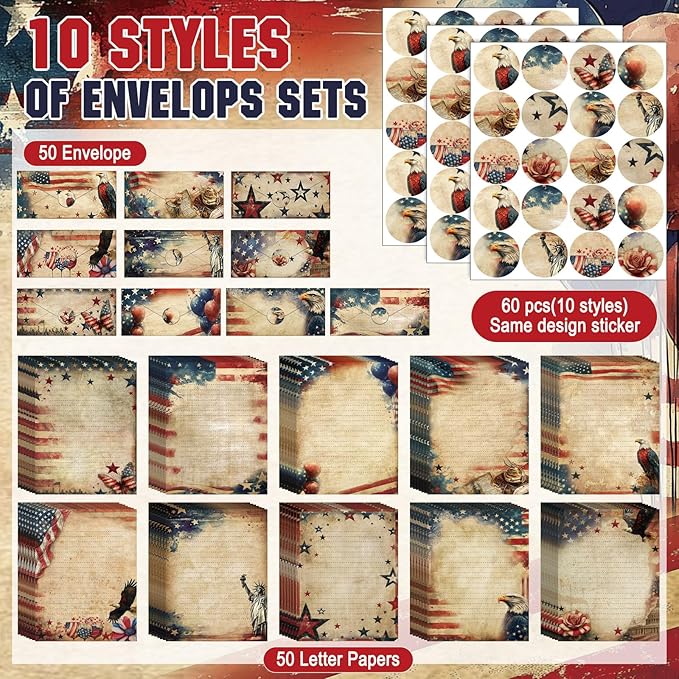 - Patriotic Paper Stationery Set: you will receive 50 stationery paper and envelopes letter sets, including 50 pieces of letter writing papers, 50 matching envelopes with 60 dot stickers; The sufficient quantity and rich designs cover your writing and sending needs