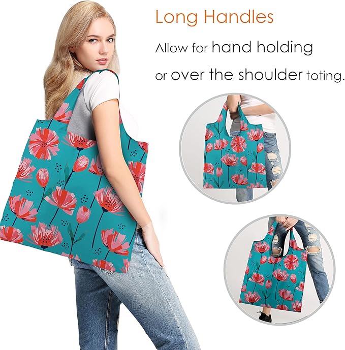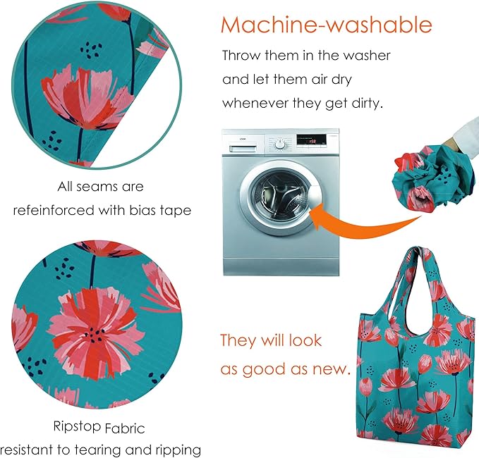 - X-LARGE CAPACITY & Sturdy: These cute reusable grocery bags are very large which can hold up to 50+ pounds of groceries and replaces 2-3 conventional grocery bags. And these foldable reusable grocery bags are reinforced with bias tape which makes them hold heavy loads safely. Long handles of the large reusable shopping bags allow for hand holding or carry on the shoulder for easier carrying, ideal reusable grocery bags bulk for shopping, groceries, travel, storage.