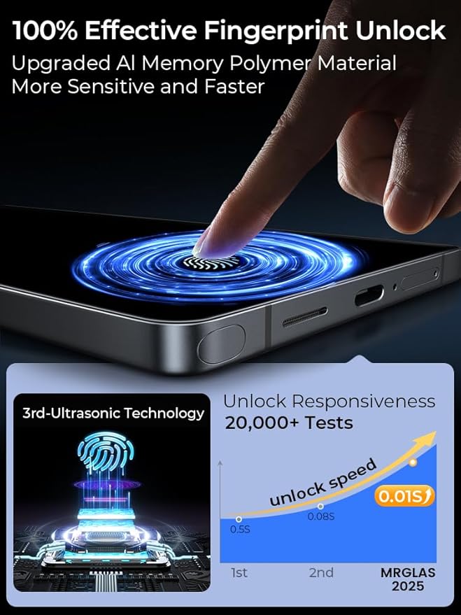 - [100% Effective Fingerprint Unlocking] MRGLAS adopts the exclusive upgraded AI memory polymer material, through the perfect combination of ultrasonic technology and well-designed material structure, to ensure the precision of touch, to realize faster and more accurate fingerprint unlocking, to completely solve the problem of delayed or ineffective fingerprint unlocking encountered in the market at the present time, and to allow you to unlock the fingerprints effortlessly within 0.001s!