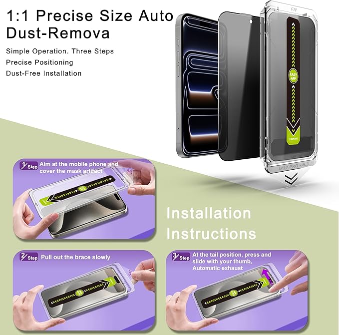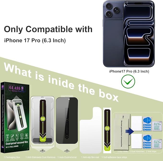 - Auto Dust Removal & Easy Installation: The SY SHANGYAN Anti-Spy Privacy Screen Protector for iPhone 17 Pro features advanced auto dust removal and self-aligning technology for a flawless,bubble-free install every time.Just place the frame,pull the tab,and press to push out any air bubbles.Installation is quick,easy,and hassle-free.For best results,watch our step-by-step installation video before applying