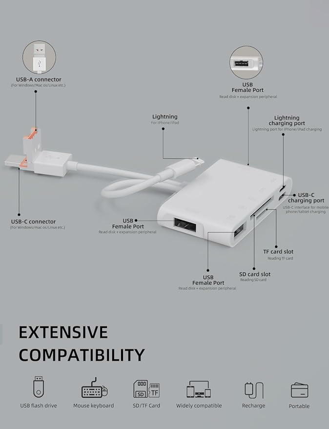 - 【Plug and Play】The ZOIOT sd card reader for i-phone is plug and play, requiring no additional software or drivers, making it extremely easy to use. It features three USB ports, TF and SD card slots, Lightning and USB-C (TYPE-C) charging ports. Simply connect it to an i-Pad/i-Phone or other USB-C device, wait a few seconds, and start transferring files immediately.