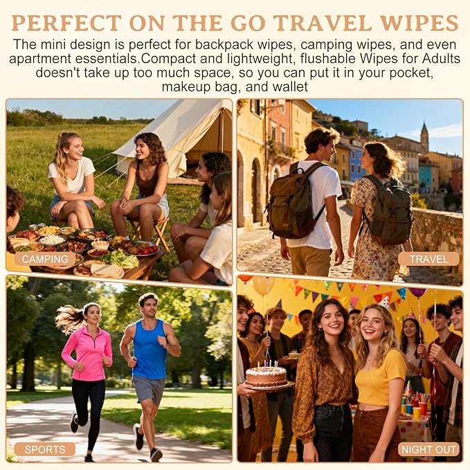 - Perfect on the go travel wipes: flushable wipes unscented have a size of 5.5 x 6.3 inches and an outer packaging of 2.4 x 3.1 inches. The mini design is perfect for backpack wipes, camping wipes, and even apartment essentials. Compact and lightweight, flushable Wipes for Adults doesn't take up too much space, so you can put it in your pocket, makeup bag, and wallet
