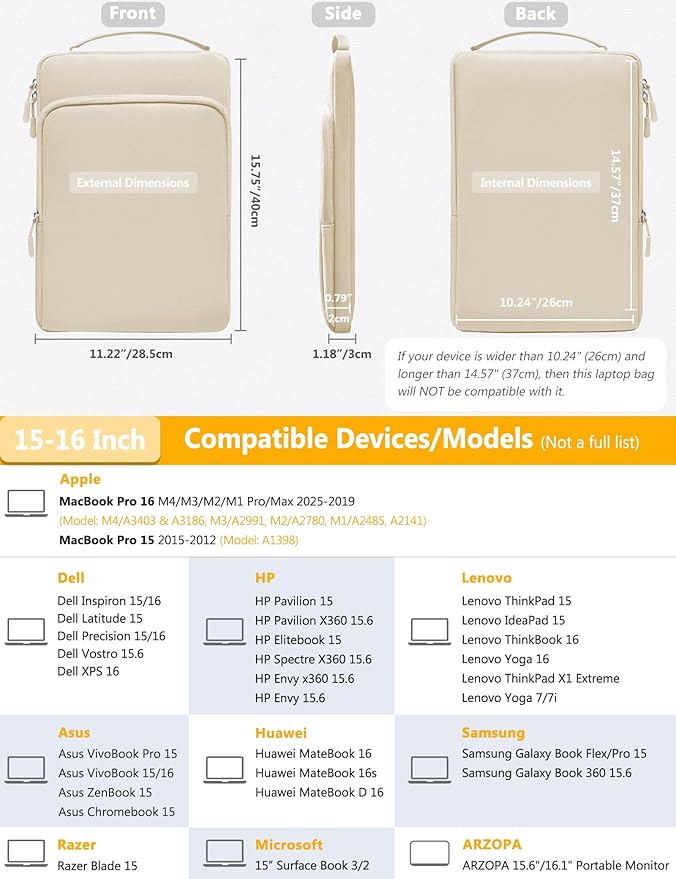 - Internal Dimensions: 14.57" x 10.24" x 0.79". Compatible with MacBook Pro 16 M4/M3/M2/M1 Pro/Max 2025-2019 (A3186, A3403, A2991 A2780 A2485 A2141), MacBook Pro 15 2015-2012 (A1398), 15" Surface Book, Dell Inspiron/Latitude/Precision/Vostro 15, HP Pavilion/Elitebook/Envy 15, HP Pavilion/Spectre/Envy X360 15.6, Samsung Galaxy Book Flex/Pro 15, Lenovo IdeaPad/ThinkPad 15, Yoga/ThinkBook 16, Asus ZenBook/VivoBook Pro 15, VivoBook 15/16, Razer Blade 15, ARZOPA 15.6"/16.1" Portable Monitor, etc.
