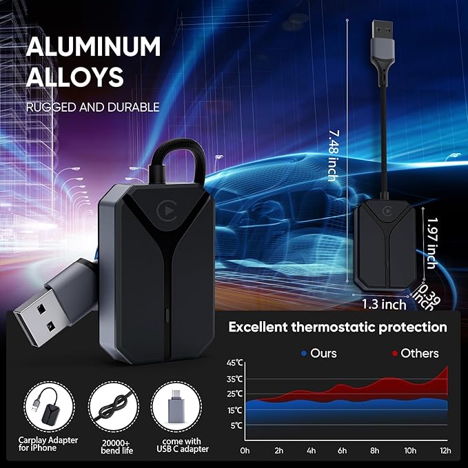 - aluminum alloy dongle: Metal casing boosts heat dissipation. Temperature control maintains 0-15°C to protect car's USB port—no overheating during extended use. Passed 100,000+ insertion tests for wobble-proof durability. Includes Type-C port.
