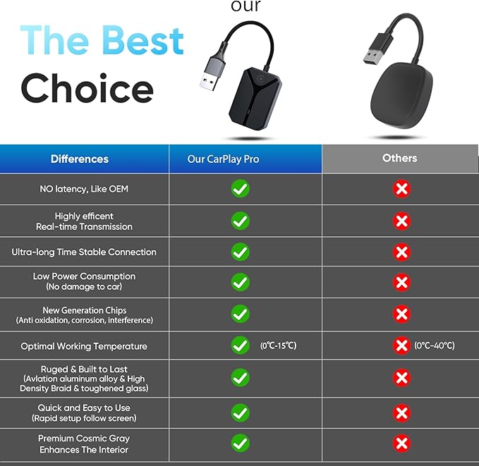 - Reliable Performance: CarPlay Wireless delivers advanced V851S chip, dual-band Wi-Fi (2.4GHz+5GHz), and 20MHz/40MHz bandwidth for zero-interference connectivity. Enjoy smooth video calls, uninterrupted music playback, and lag-free map updates.