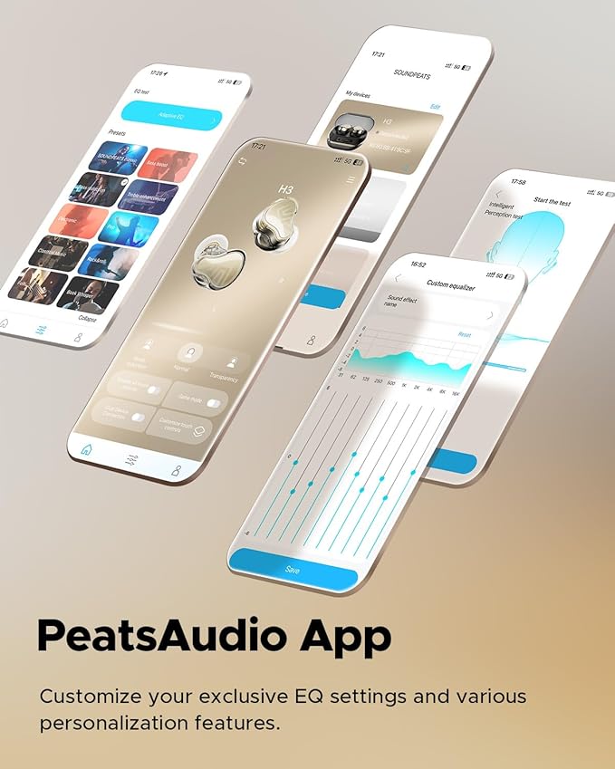 - Personalized Listening via App: Tailor your sound with the SOUNDPEATS H3 via the PeatsAudio App. Adjust EQ settings to enhance bass, mids, or treble to your liking, or assign custom touch controls for volume, playback, and more. Multi-point connection, real-time battery display, and fit test features all work together to deliver a seamless, personalized audio journey.