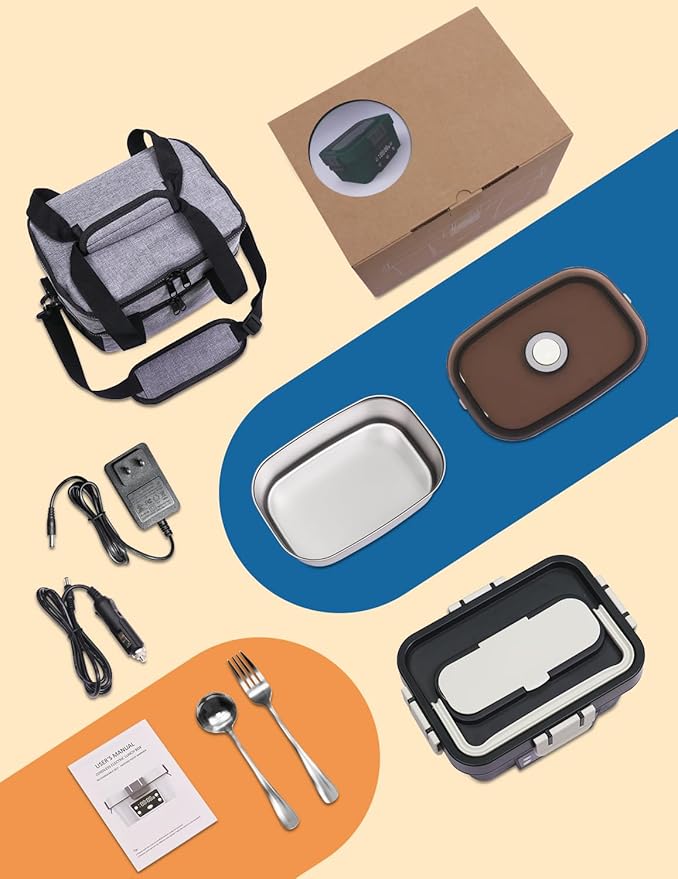 - Included Components : Insulated bag, Fork, Power cord, Spoon, Leak-proof lunch box lid, Instruction manual, Stainless steel meal container, Heated lunch box cordless Insulated bag, Fork, Power cord, Spoon, Leak-proof lunch box lid, Instruction manual, Stainless steel meal container, Heated lunch box cordless