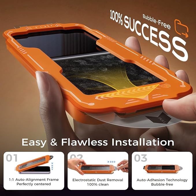 - Flawless Installation—Zero Guesswork, Zero Stress:No bubbles. No dust. No mistakes. Featuring a 1:1 auto-alignment frame, electrostatic dust elimination, and auto-adhesion technology, this screen protector for iPhone 17 guarantees professional-level installation in seconds. Simply align, pull, and done—with a 0% failure rate. Whether you're perfectionist or installing for the first time, achieving perfection is effortless.