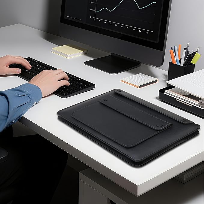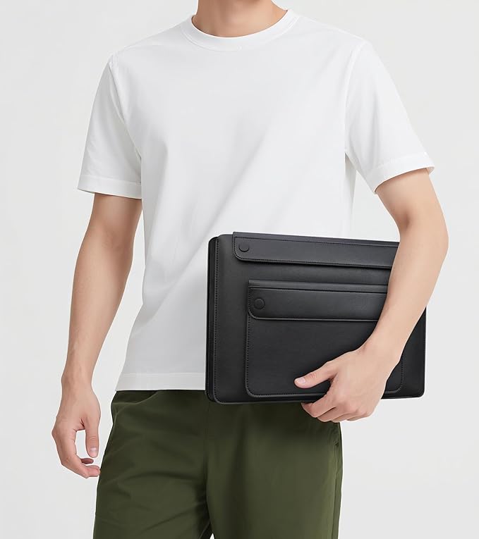 - Style Meets Functionality: Slim and lightweight profile despite holding 3+ devices. Elegant envelope-style design in versatile black leather looks professional for both men or women. This All-in-One laptop sleeve will gonna get you never juggle multiple bags again – your laptops, tablet, keyboard, and essentials fit sleekly in one laptop sleeve, transfer easily from office to campus to flights.