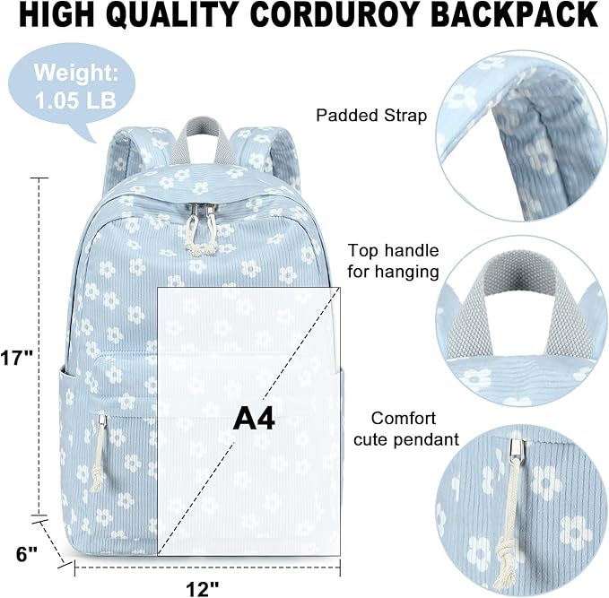 - Cute corduroy material is soft, durable, and machine washable. Lightweight backpack can hold up the weight of everything a highschooler needs in their pack. Perfect for travel carry on backapck wherever you want to go.