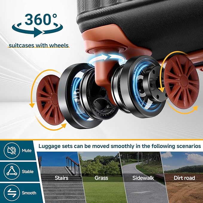 - 360° Universal Wheels and Handles- Each suitcase is equipped with 4 silent universal wheels that can rotate 360°. The new soft TPU and lubricated balls inside the wheels make the suitcase move smoothly and absorb shock.