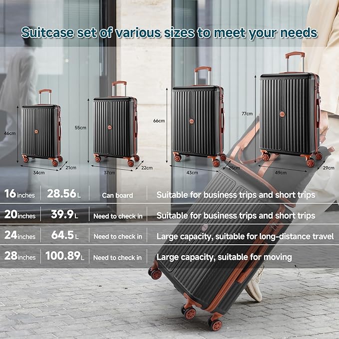 - Luggage Set Introduction - The 6-piece set includes 4 suitcases of 16/20/24/28 inches, a handbag that can be expanded 10cm vertically, and a small cosmetic bag. The 20-inch suitcase size is approved by airlines for business trips.