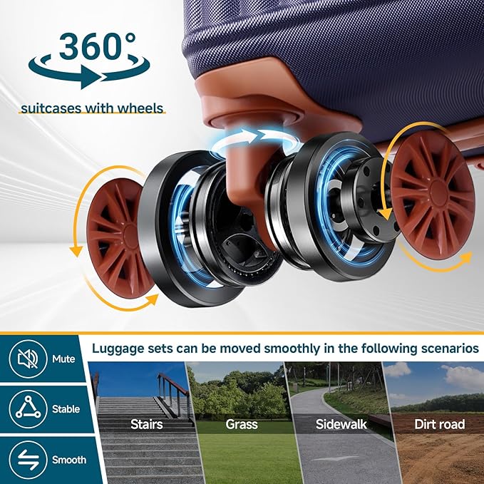 - 360° Universal Wheels and Handles- Each suitcase is equipped with 4 silent universal wheels that can rotate 360°. The new soft TPU and lubricated balls inside the wheels make the suitcase move smoothly and absorb shock.
