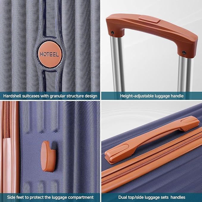 - Other high-quality details- There are rubber handles on the top and sides of the suit case, which is convenient for carrying the suitcase when going up and down stairs. There are 4 side feet on the side of the suitcase, which can be used to hang your bag or protect the shell when lying on the side of the suitcase.