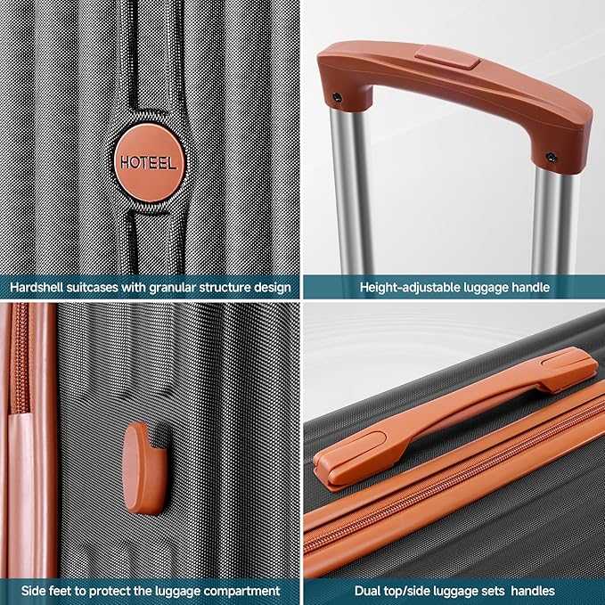 - Other high-quality details- There are rubber handles on the top and sides of the suit case, which is convenient for carrying the suitcase when going up and down stairs. There are 4 side feet on the side of the suitcase, which can be used to hang your bag or protect the shell when lying on the side of the suitcase.