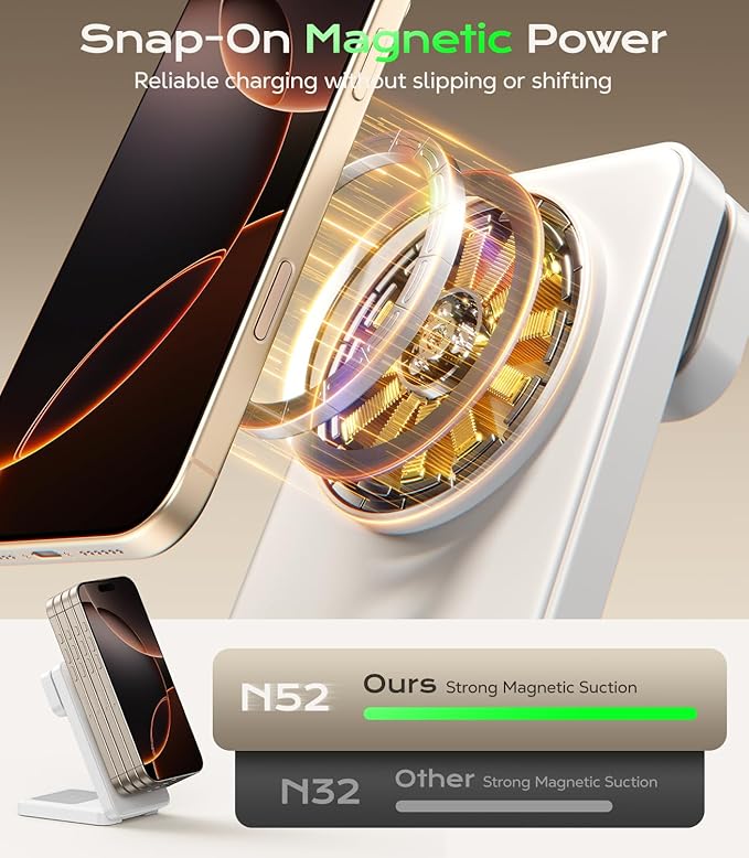 - STRONG MAGNETIC SNAP & ADJUSTABLE VIEWING ANGLE: Built-in high-grade magnets align instantly with MagSafe-enabled iPhones for secure, efficient, and stable charging.The phone charging pad supports 0-65°adjustment, letting you find the perfect viewing angle for FaceTime, streaming, or browsing. No slipping, no misalignment--just effortless snap-on charging in portrait or landscape mode
