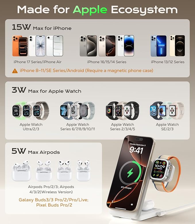 - 3 IN 1 FAST CHARGER STAND FOR APPLE ECOSYSTEM: 15W Max Mag Safe wireless charging compatible with iPhone 17 Pro Max/17 Pro/iPhone Air/17/16 Pro Max/ 16 Pro/ 16 Plus/ 16/ iPhone 15 Pro Max/ 15 Pro/ 15 Plus/ 15/14 Pro Max/ 14 Pro/ 14 Plus/ 14/ 13 Pro Max/ 13 Pro/ 13/ 13 mini/ 12 Pro Max/ 12 Pro/ 12/ 12 mini; Pixel 10 Series; 3W MAX for Apple Watch S11/S10/S9/S8/S7/S6/S5/S4/SE/SE 2/SE 3; iWatch Ultra 3/2/1; 5W MAX for AirPods Pro 3/2/AirPods Pro/AirPods 3/4/2 (with Wireless Charging Case)