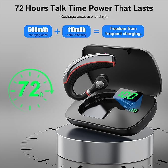 - 【DURABLE & SWEAT-RESISTANT WITH POWER DISPLAY】 IPX5-rated sweat and water resistance keeps up with long hours at the office or during commutes. Charging case features a digital display so you always know your battery status. Ideal as a trucker and office Bluetooth headset for clear hands-free calls and hands-free headset for cell phone, this Bluetooth earpiece delivers reliable performance