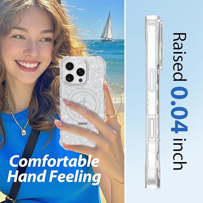 Magnetic for iPhone 16 Pro Case with Invisible Stand, Compatible with MagSafe, Clear Bling Sparkle Shockproof Slim Anti-Slip Military Drop Protection Hard Phone Case 6.1" Glitter Silver