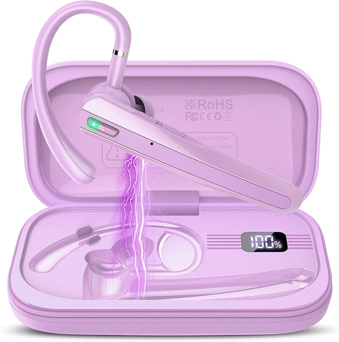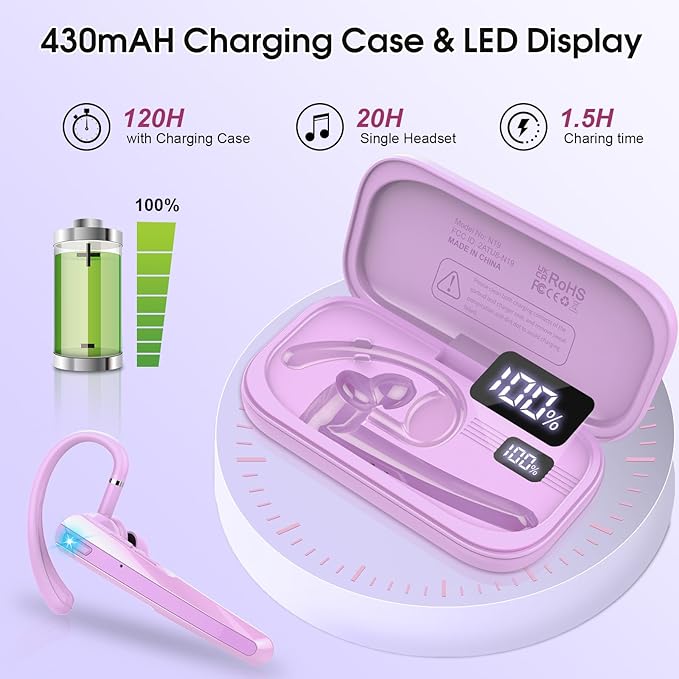 Bluetooth Headset V5.3, Wireless Earpiece with Dual ENC Noise Canceling Mic, 120H Hand-Free Talk Single-Ear Bluetooth Earpiece with LED Display, IP7 Waterproof Headphones for Trucker/Business, Purple