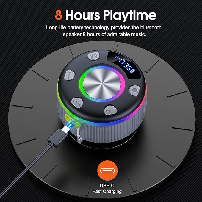 - 7 LED Light Modes and 8 Hour Playtime: The waterproof shower bluetooth speaker features 7 lighting modes that display 6 different colors. By blending colors that flash in sync with the beat, it creates a pulsating light show for every song, enhancing both your auditory and visual experience. It makes an ideal gift for men, women, friends, or children. Equipped with a built-in 1000 mAh battery, just 1.5 hours of charging provides 7-8 hours of continuous playback at 40% volume