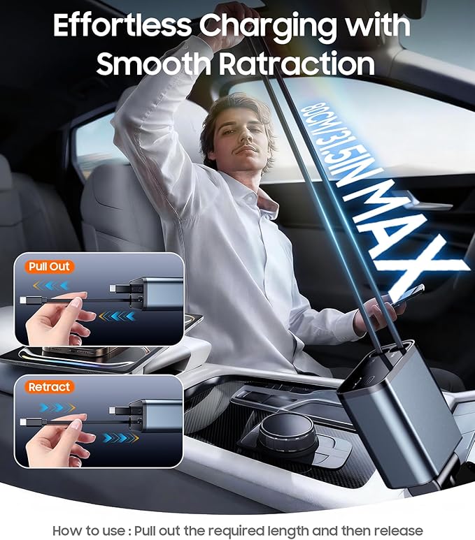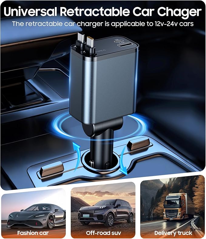 - [Universal Vehicle Compatibility]This versatile charging solution demonstrates broad compatibility across most 12V-24V automotive systems, featuring a secure plug design that maintains stable connection in various cigarette lighter sockets. The charger remains firmly seated even when traversing uneven road surfaces, making it particularly suitable for long-distance commuters and outdoor enthusiasts.This car charger is a must-have for technically proficient drivers.car charger retractable cord retracts back inside automatically for storage, keeping it clean and tidy without cable entanglement, and car organization facilitating convenient control and usage