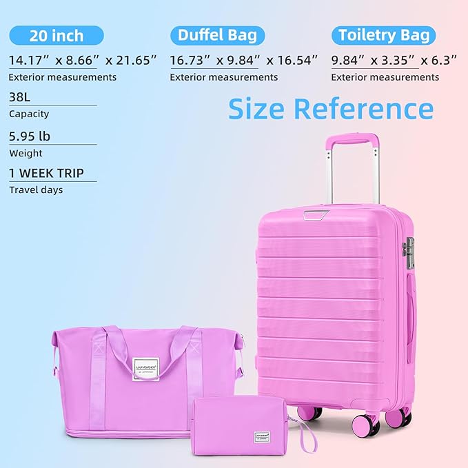 - Three-Piece Luggage Sets: The luggage sets include a 20inch carry-on suitcase and a travel duffel bag; toiletry bag. The 20-inch suitcase is great for short trips or as a carry-on option. It meets most airline size restrictions, allowing you to avoid checked baggage fees.The duffel bag comes with a 30% expandable capacity, offering additional space when needed. The toiletry bag is designed for compact yet convenient storage of your grooming essentials